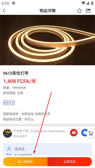 3、在商品詳情頁,查看0612柔性燈帶的價格數量等信息,了解物品所在位置及賣家信息,確認商品詳情。