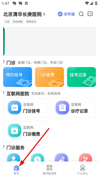 1、進入首頁,可進行預約掛號、門診繳費、查看掛號記錄,使用互聯網門診掛號、查看診療記錄、進行門診繳費等服務,開啟就醫流程。