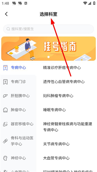 3、選擇科室時,可搜索科室或醫生,選擇專病中心、專病門診等不同科室類型,根據病情選擇合適的科室就診。