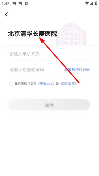 2、進行登錄時,輸入手機號碼和短信驗證碼,勾選同意服務協議及隱私政策后點擊登錄,進入醫院服務系統。