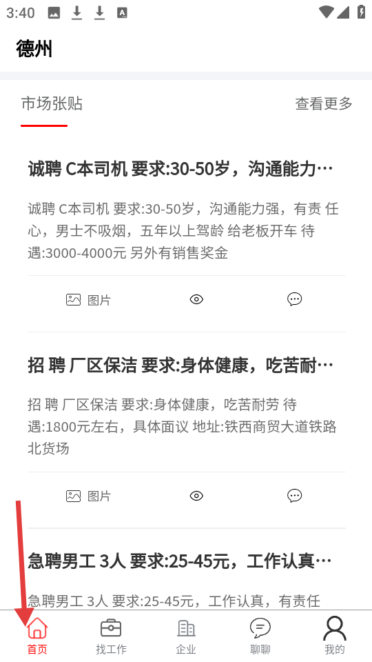1、點擊首頁展示德州招聘,有C本司機、保潔崗等,明確薪資待遇,還有查看更多,開啟更多求職選擇。