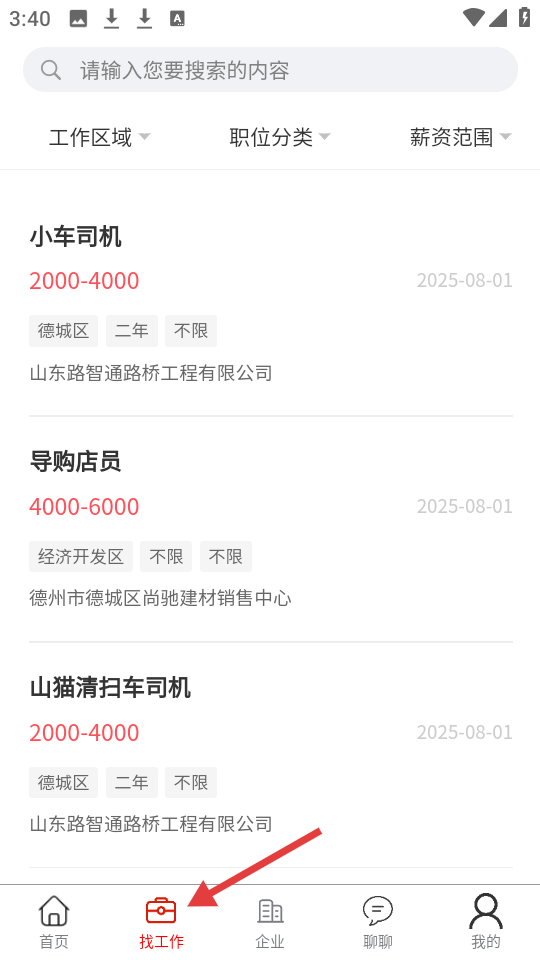 2、找工作頁面羅列多樣崗位,如小車司機、導購店員等,附帶薪資、區域等詳情,支持條件篩選。