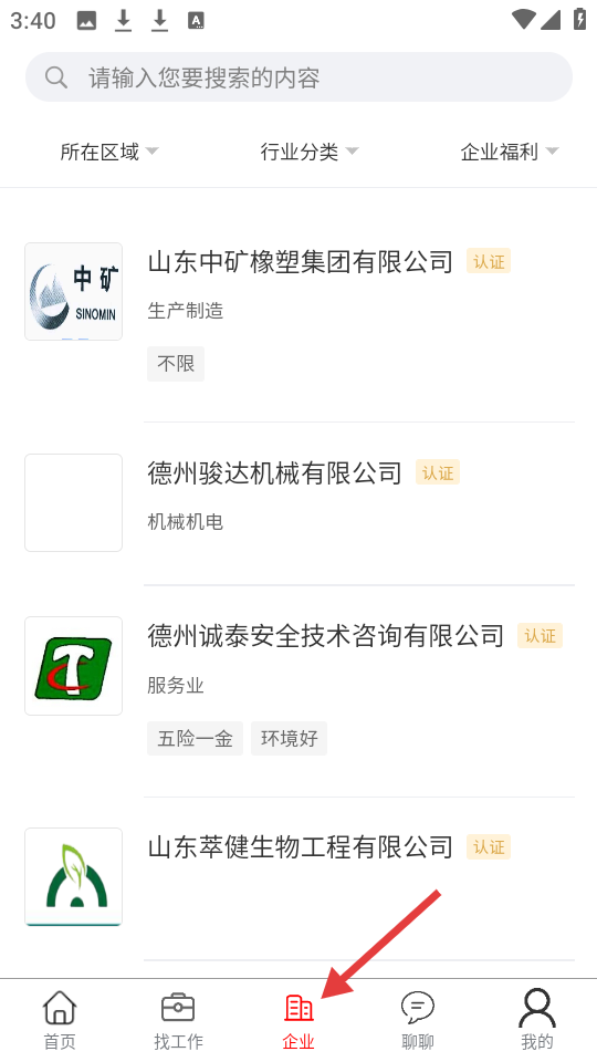 3、企業頁面展示山東中礦橡塑集團等企業,標注行業、福利與認證狀態,方便求職者了解企業背景。