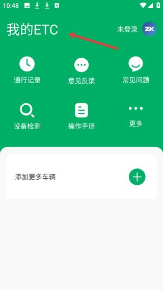1、點擊我的ETCAPP主頁,綠色界面簡潔,顯示未登錄,設有通行記錄等功能,下方可添加更多車輛,方便管理。
