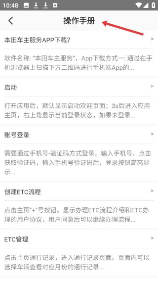 2、點擊操作手冊頁面,含本田車主服務APP下載等指引,從啟動到賬號登錄等步驟清晰,助用戶快速上手操作。