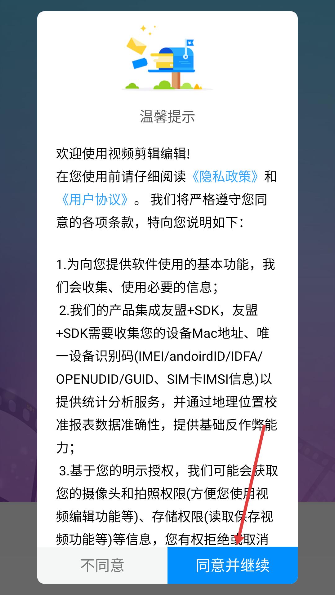 1、使用前閱讀隱私政策,了解用戶協議,同意后進入首頁,選視頻剪輯等,開始制作。