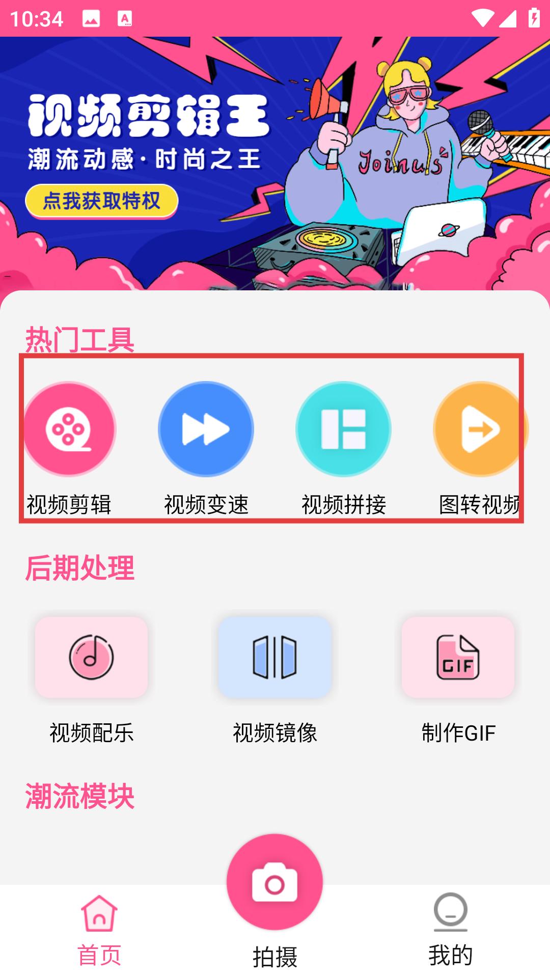 2、在首頁,用視頻變速拼接,利用熱門工具,剪輯視頻,添加配樂、制作GIF。