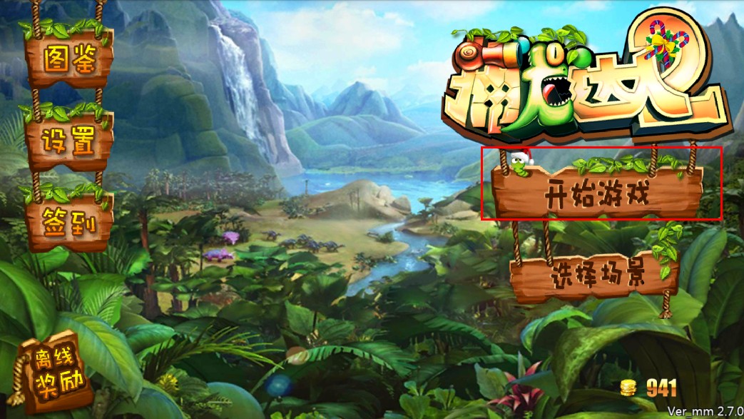 1、進入游戲界面,能看到圖鑒、設置等功能選項,點擊開始游戲按鈕,即可開啟捕龍冒險,進入游戲場景。