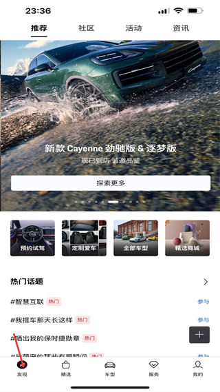 1、發現頁是品牌資訊聚合區,展示新車信息與熱門話題,提供試駕等入口,是用戶獲取品牌動態的核心頁面。