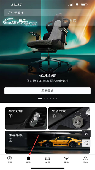 2、精選頁聚焦品牌周邊,售賣車主好物與生活方式商品,分品類陳列,是車主獲取保時捷周邊的商城入口。
