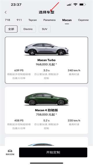 3、車國頁提供車型選擇與定制功能,展示車型參數及價格,支持篩選,是用戶了解、定制保時捷車型的頁面。