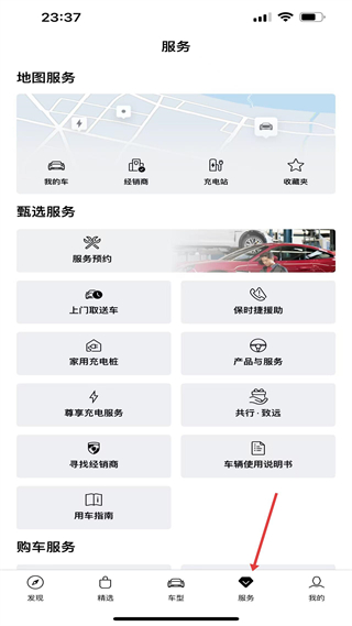 4、服務頁整合地圖與用車服務,含經銷商、上門送車等功能,是車主獲取保時捷配套服務的集中平臺。