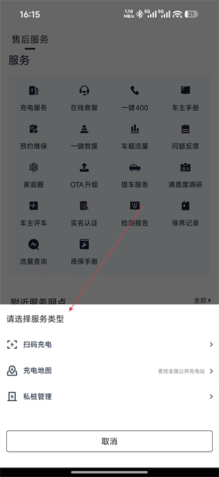 2、在服務類型彈窗中選擇對應的服務類型,比如充電相關服務,查看對應的服務網點信息。