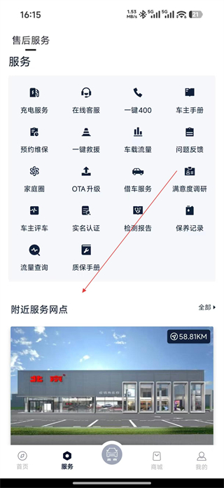 「服務」新增服務板塊,匯集充電服務、在線客服、一鍵400、車主手冊、服務網點、預約維保、問題反饋等功能;