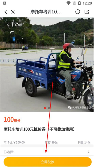 4、確認積分足夠且符合需求后,點擊立即兌換按鈕,完成該抵價券的兌換操作,可用于后續摩托車培訓消費抵扣。