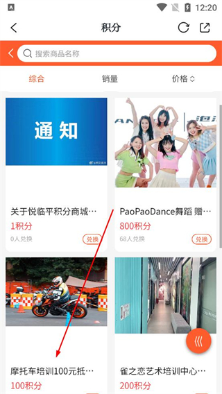 3、在積分頁面,選擇摩托車培訓100元抵價券條目,點擊進入該商品的詳情頁面,查看所需積分及兌換規則。