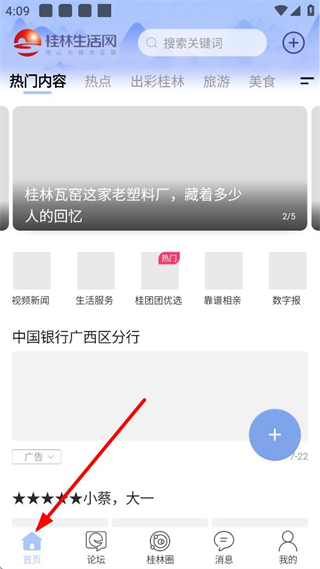 1、進入首頁界面,可查看熱門內容、熱點、出彩桂林、旅游、美食等板塊,有視頻新聞、生活服務、桂團團優選等功能入口。