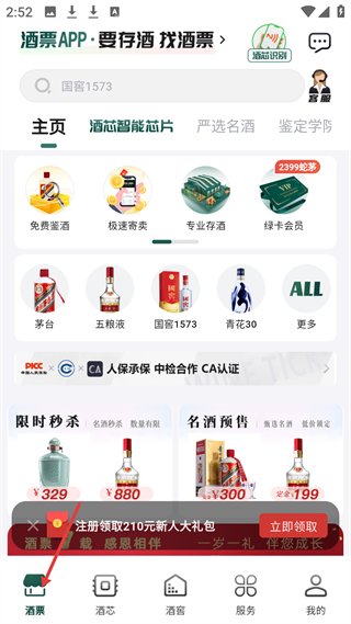 1、酒票頁有免費鑒酒、極速寄賣等功能入口,展示茅臺、五糧液等名酒分類,還有限時秒殺、名酒預售板塊,提供新人注冊專屬大禮包。