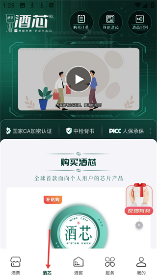 2、酒芯頁展示酒芯智能芯片產品,有購買訂單、我的酒芯等功能入口,具備國家CA加密認證、中檢背書、人保承保等保障。