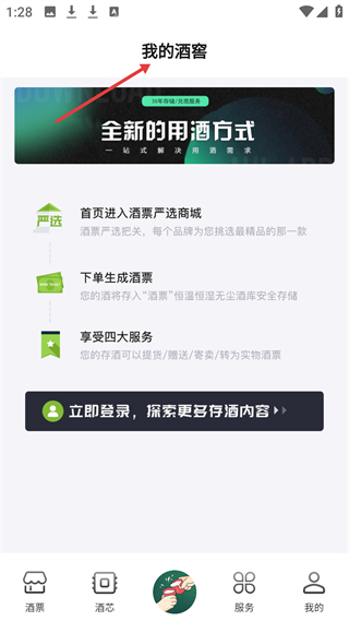 3、酒窖頁介紹全新用酒方式,可進入酒票嚴選商城下單生成酒票,享受提貨、贈送等四大服務,存酒于恒溫恒濕酒庫。