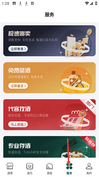 4、服務頁提供極速寄賣、免費鑒酒、代客找酒、專業存酒等服務,分別對應快速打款、24小時鑒定、定制找酒、安全存儲功能。