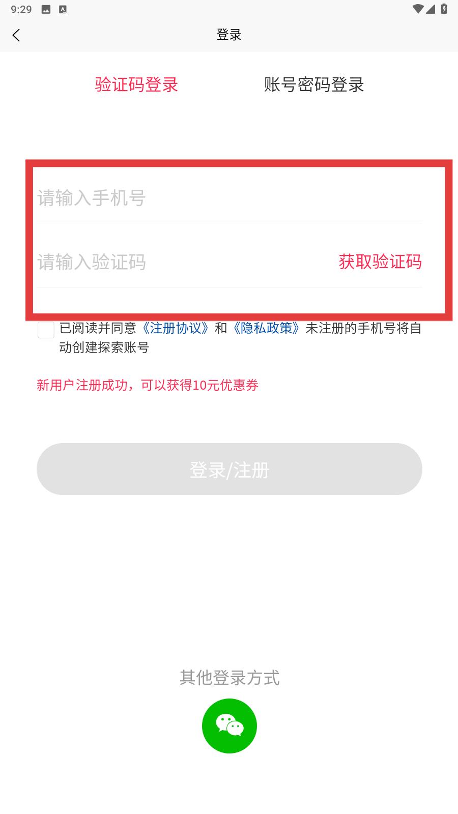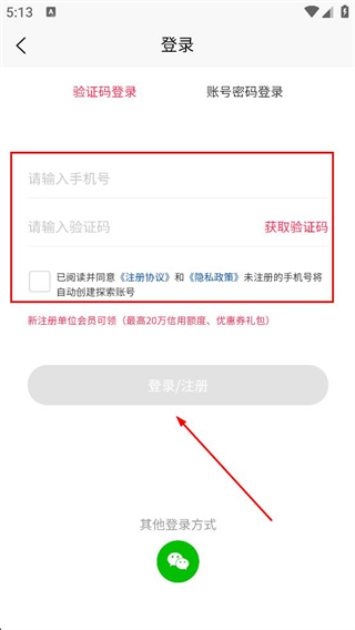 2、在登錄頁面選擇驗證碼登錄,輸入手機號,獲取并輸入驗證碼,勾選已閱讀并同意注冊協議和隱私政策,點擊登錄注冊,完成賬號登錄。