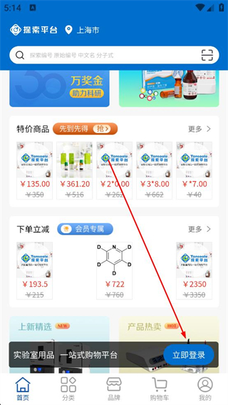 1、打開探索平臺APP,進入首頁可看到特價商品、下單立減等板塊,還有上新精選、產品熱賣區域,點擊我的頁面的立即登錄,進入登錄頁面。