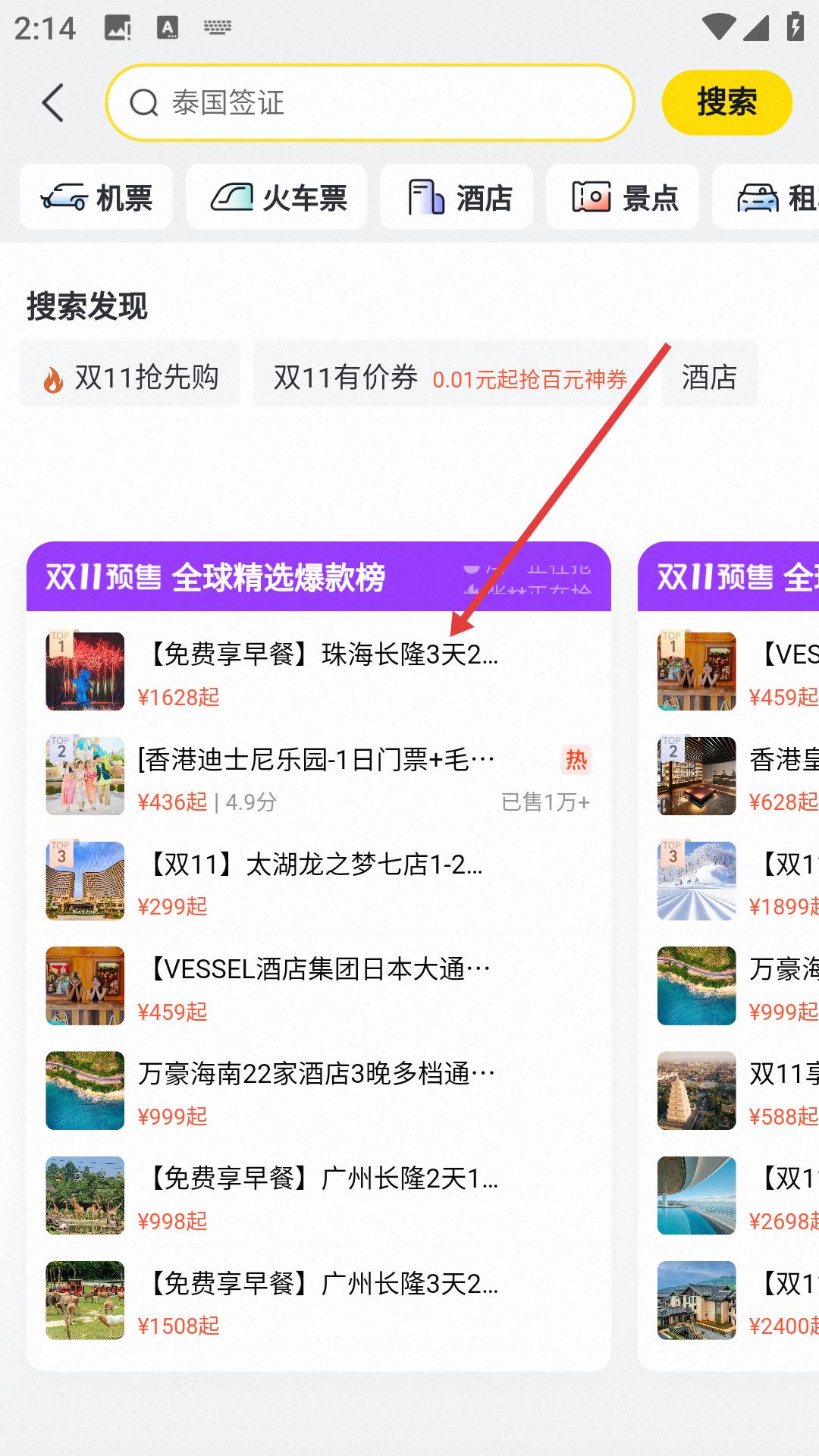 1、打開飛豬旅行APP,進入主界面在搜索欄輸入相關內容或直接瀏覽,找到珠海長隆相關套餐推薦,點擊進入該套餐詳情頁面。