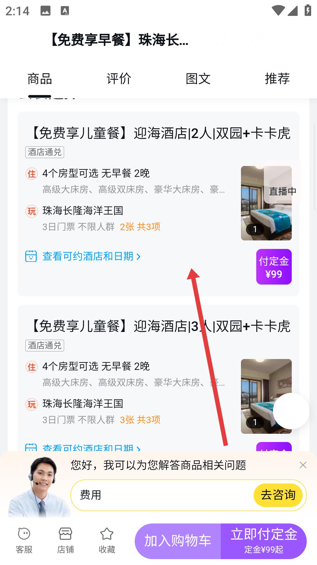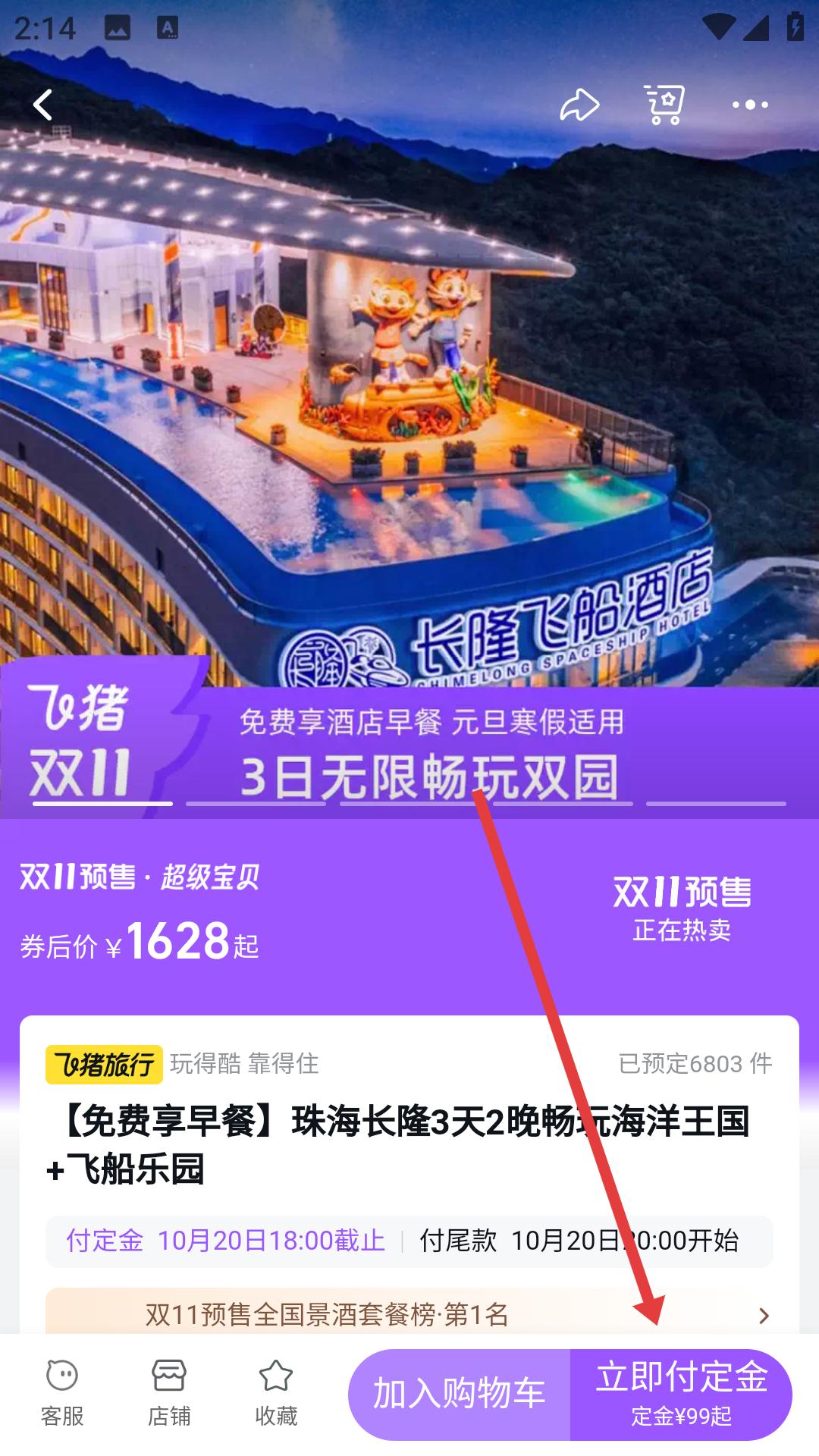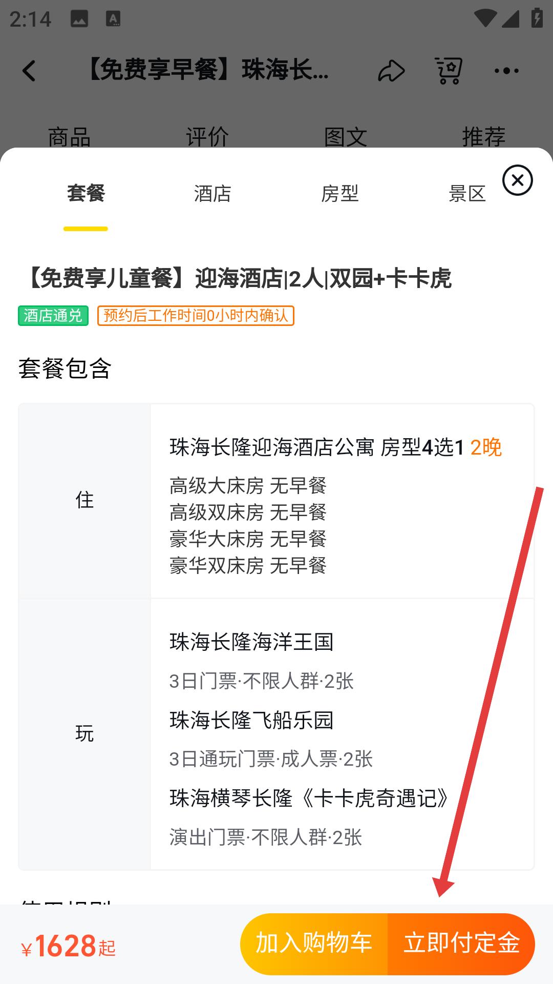 2、在珠海長隆套餐詳情頁面,查看套餐的基本信息,如價格、包含服務等,點擊立即付定金按鈕,進入具體套餐選擇界面。