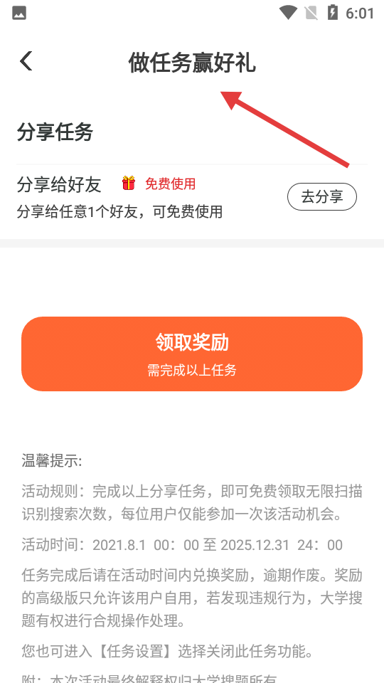 2、做任務贏好禮界面分享任務亮眼,將其分享給任意1好友,即享免費使用機會,完成任務還能領無限掃描獎勵。
