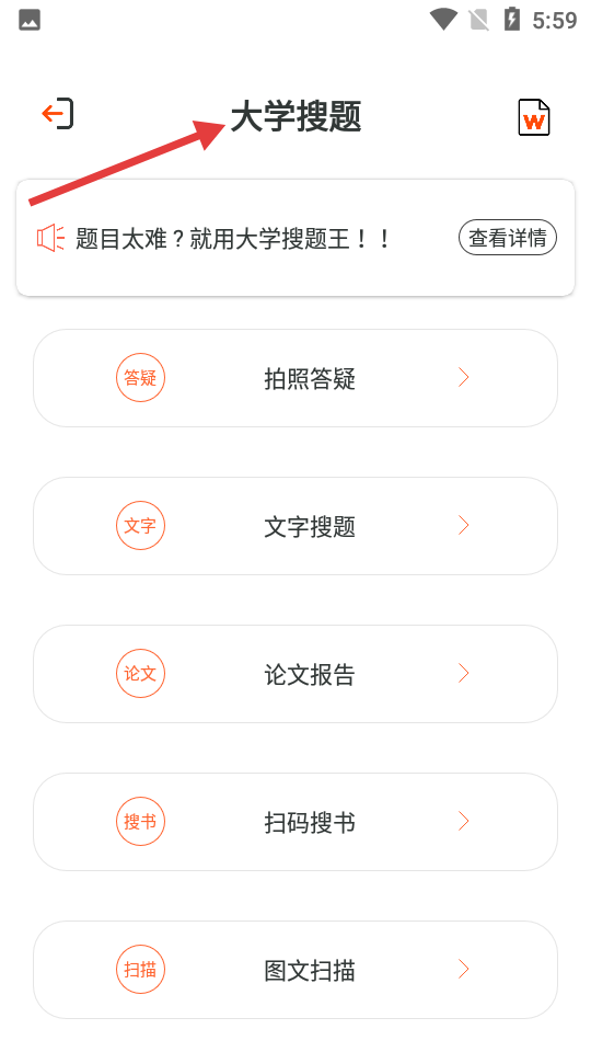 3、點擊大學搜題更多功能頁,拍照答疑、文字搜題、論文報告等功能一應俱全,滿足大學學習中搜題查書掃描等多樣需求。