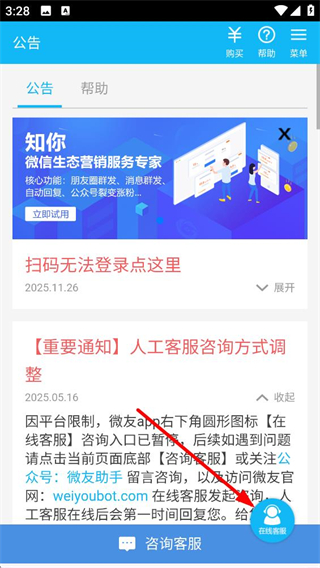 1、工具首頁公告欄,可查看掃碼登錄指引及客服咨詢方式調整通知,若遇問題,可通過點擊咨詢客服或關注公眾號等方式聯系人工客服。
