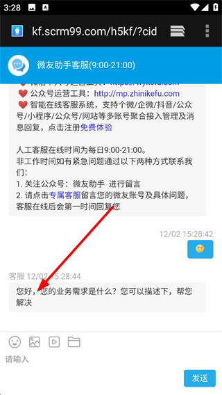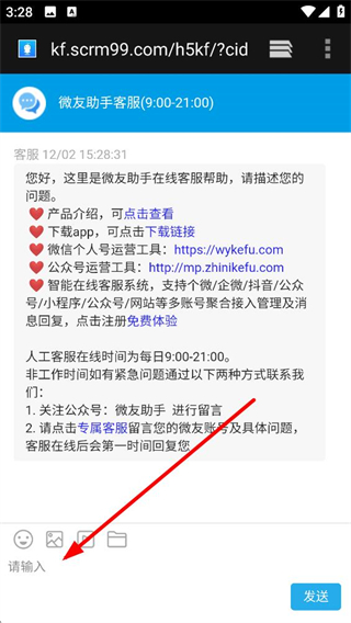 2、進入微友助手客服界面,能查看產品介紹下載鏈接等信息,還可了解客服在線時間,輸入框填寫需求后點擊發送,即可向客服反饋問題。