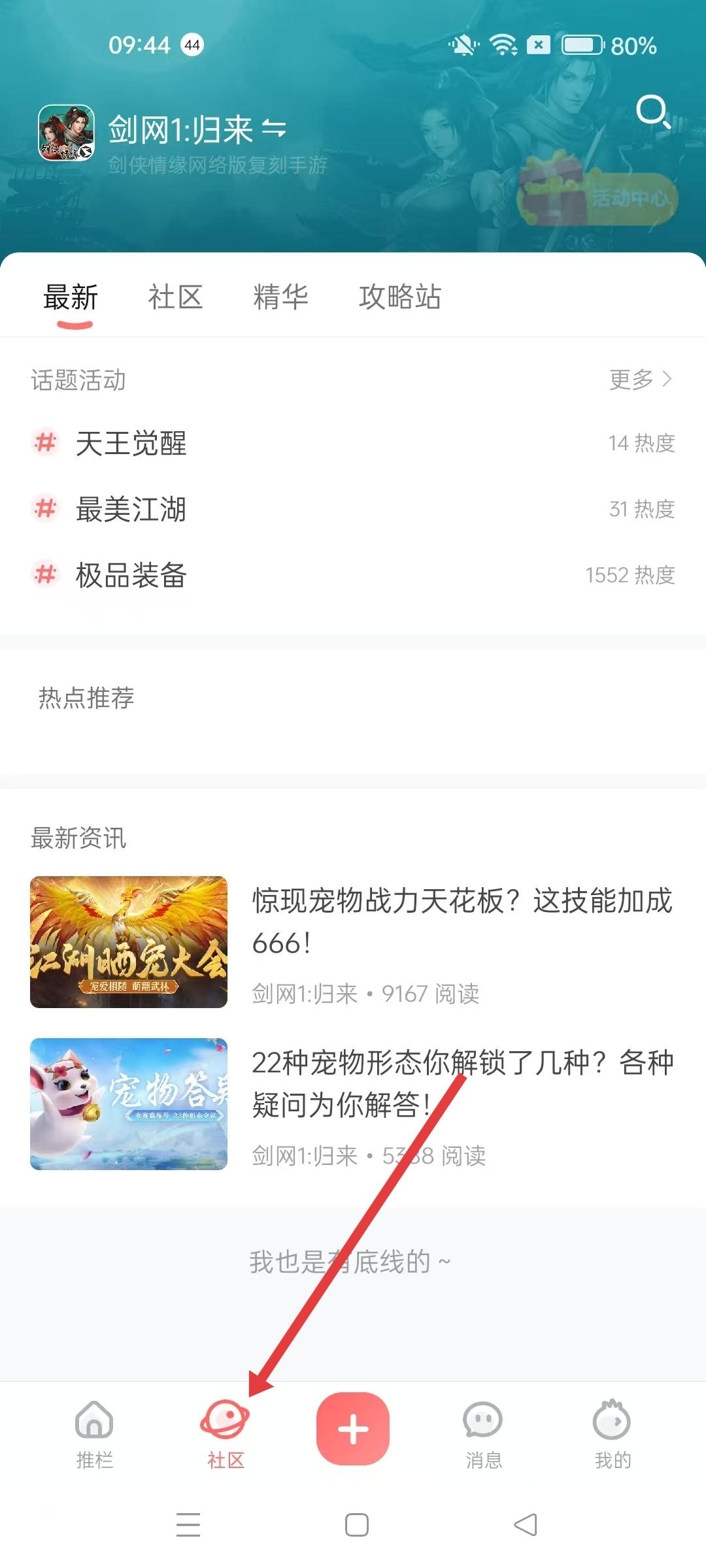 2、劍網1歸來社區頁面,可瀏覽最新、社區等板塊,查看話題活動、熱點推薦和最新資訊,參與游戲社區互動。