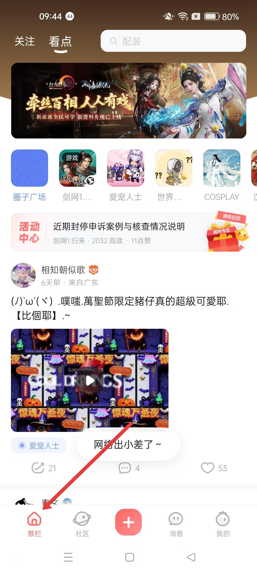 4、進入推欄頁面,可查看關注、看點等板塊,瀏覽圈子廣場、游戲資訊和用戶動態,獲取游戲相關內容。
