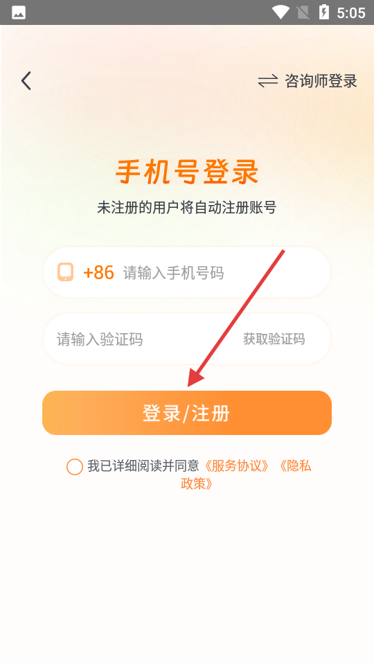 1、登錄頁面主打手機號登錄,未注冊者自動注冊,在此輸入手機號與驗證碼勾選同意協議后,即可點擊登錄注冊開啟服務。
