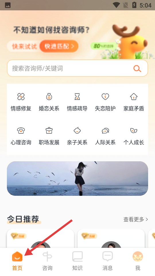2、首頁為用戶搭建便捷咨詢入口,有搜索功能,分類展示情感修復等多方面咨詢方向還推薦當日咨詢師。