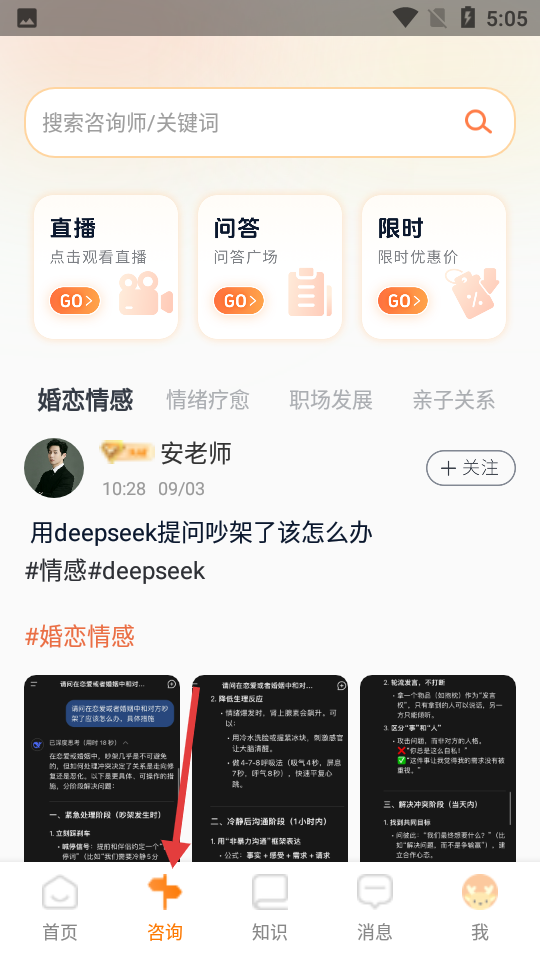 3、咨詢頁面集直播、問答、優惠活動于一體,圍繞婚戀情感、職場發展等主題,呈現咨詢師分享的觀點與討論話題。