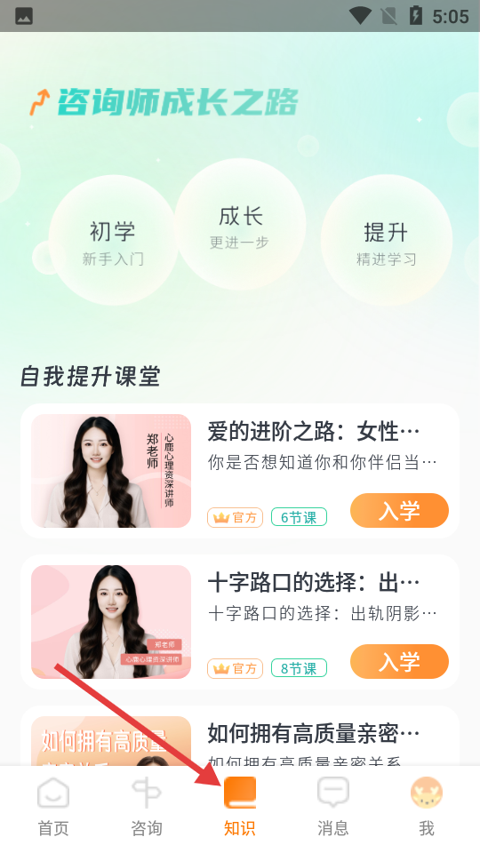 4、知識頁面專注咨詢師自我成長,按階段劃分,提供豐富課程,如鄭老師講授的情感進階課程助力專業提升。