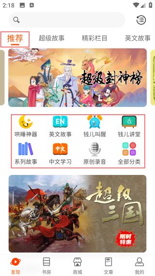1、頂部導航有推薦,超級故事、精彩欄目、英文故事選項,可切換查看不同內容推薦。