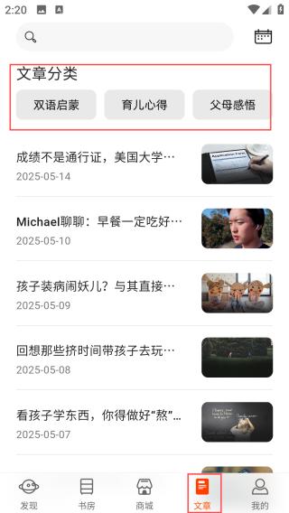 3、點擊文字板塊,可以查看雙語啟蒙、育兒心得、父母感悟等其他文章。