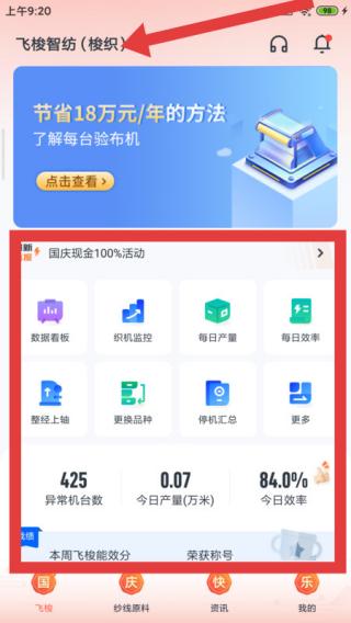 1、飛梭紡織app首頁有國慶活動及數據看板等功能入口,還可以顯示異常機臺數等實時數據。