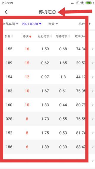 2、飛梭紡織app的停機匯總頁面,展示機臺運行時長、總停時長及效率等數據,便于監控設備狀態。