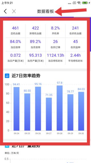 3、飛梭紡織app的數據看板頁面,呈現總機臺數、開機率等關鍵指標,及7日效率趨勢,助力生產管理分析。