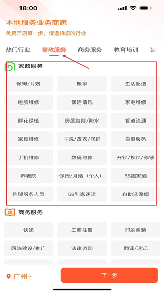 1、家政服務行業選擇界面,涵蓋保姆月嫂、搬家等多種家政服務,助力家政類商家精準定位行業,滿足家庭生活服務需求。