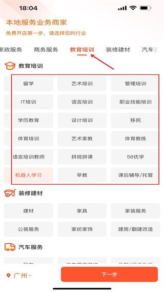 2、教育培訓行業選擇界面,包含留學、藝術培訓等細分領域,覆蓋學歷到職業技能培訓,方便教育類商家選業務方向。