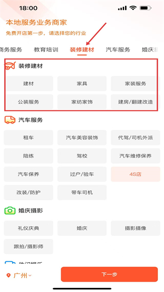 3、裝飾建材行業選擇界面,涉及建材、家具等裝飾建材領域,涵蓋公裝家裝服務,助力裝飾建材商家確定經營領域。