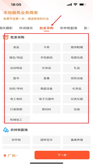 4、批發采購行業選擇界面,包含食品、服飾等眾多批發品類,覆蓋多個商品領域,便于批發采購商家選擇所屬行業。
