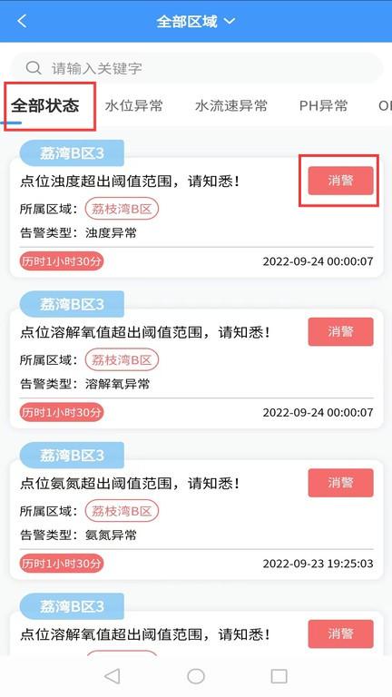 1、打開積水監測APP,進入全部區域頁面,篩選全部狀態,針對異常告警條目,點擊消警,處理告警信息。