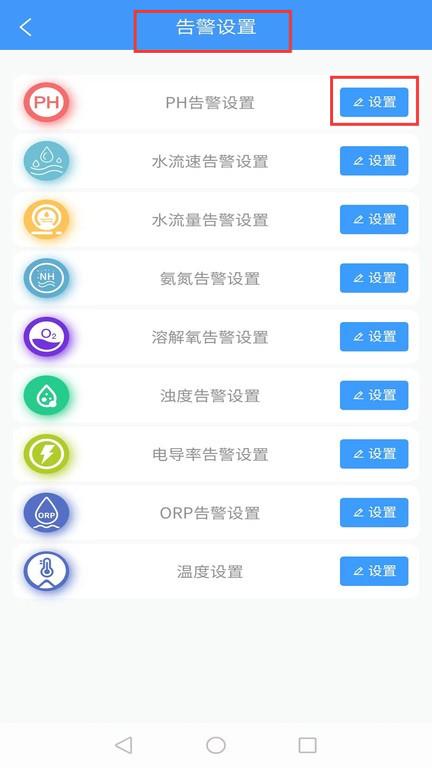 3、點擊告警設置界面,選擇PH等告警類型,點擊設置,配置對應告警閾值與觸發規則。